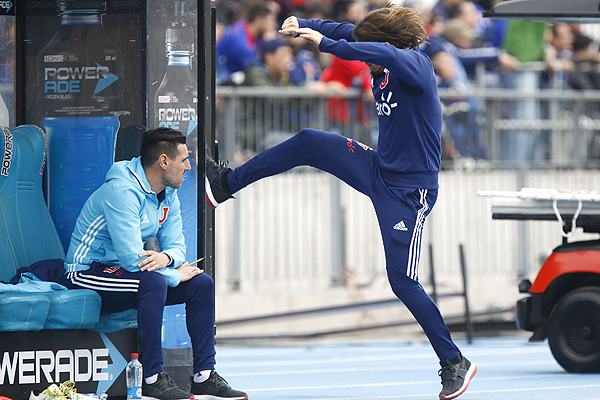 Pero vino lo peor: A los 19 minutos del pleito salió el centro por la izquierda de José Pedro Fuenzalida, la bola impactó el palo y rebotó en Gonzalo Jara. Autogol del defensa y la UC celebraba el primer tanto en un repleto Estadio Nacional. El entrenador azul se tomó la cabeza con las dos manos y comenzó a caminar rápidamente de un lado a otro en su zona demarcada de la banca de suplentes, la misma que abandonó varias veces y por lo que el cuarto árbitro le llamó la atención.