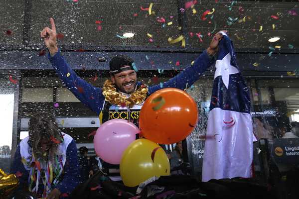 El piloto chileno fue recibido en el Aeropuerto Internacional de Santiago por familiares, quienes lo esperaron con globos, champaña y confeti para celebrar su logro.