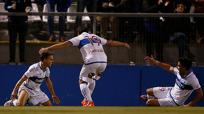 Buonanotte celebra junto a Fuenzalida y Magnasco el segundo gol de la UC en el triunfo ante la U.