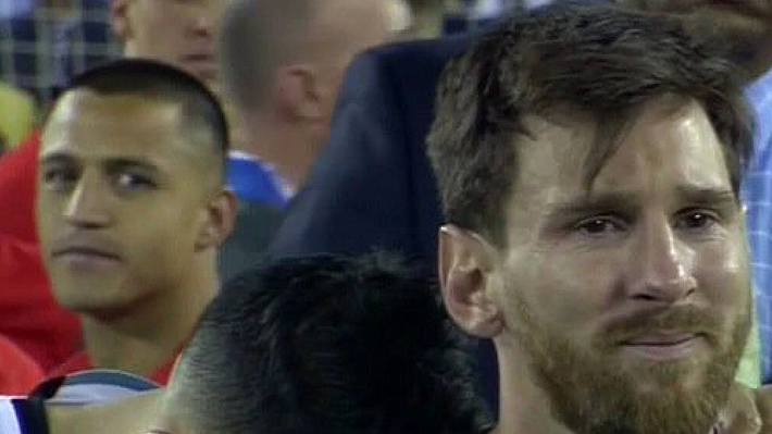 Lionel Messi no lo puede creer. Nuevamente sus lágrimas cayeron luego que la "Roja" se coronara bicampeón de América, mientras el delantero chileno Alexis Sánchez observa con mesura la copa obtenida.
