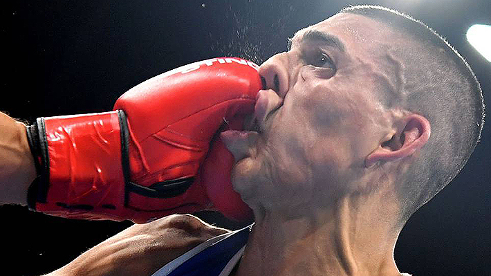 También en Río 2016, el francés Sofiane Oumiha da un potente golpe al hondureño Teofimo López durante la competición de peso pluma masculino.