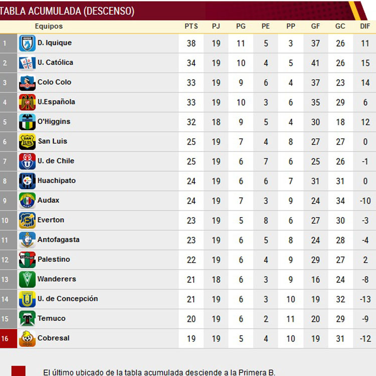 En la tabla Acumulada, Cobresal sigue siendo el colista y si el campeonato terminara hoy sería el cuadro que perdería la categoría.