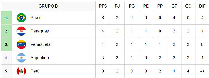 En tanto, en el Grupo B es Brasil quien lidera la zona de forma invicta y con dos triunfos, aunque aún les restan dos encuentros por disputar (hoy ante Paraguay y mañana frente a Argentina).