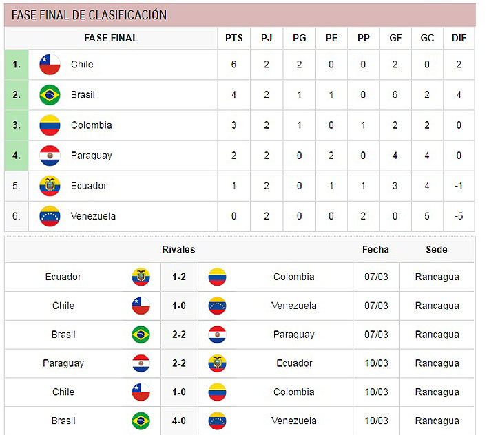 Ahora, en los compromisos válidos por la tercera fecha del hexagonal final, Colombia y el colista Venezuela abrirán la jornada, a partir de las 17:45 horas, en el estadio El Teniente de Rancagua. Después, la "Roja" se medirá con Paraguay buscando afianzarse en el liderato y dar un paso más hacia la cita planetaria, a las 20:00. Finalmente, a las 22:15, Brasil cerrará la fecha enfrentando a Ecuador.