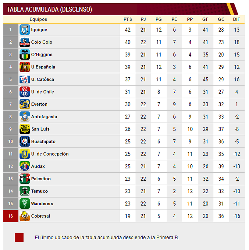 Respecto a la tabla Acumulada, es Cobresal quien sigue muy complicado, por lo que un triunfo frente a los cruzados es indispensable para salir del último lugar y alejarse del descenso.