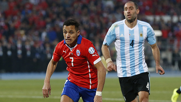 El defensa de Argentina Pablo Zabaleta disputa el balón con el atacante chileno Alexis Sánchez.
