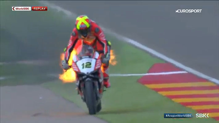 Sin embargo, fueron momentos de tensión para Forés, quien estuvo algunos instantes sobre la moto en llamas antes de poder saltar de ella para evitar el contacto con el fuego.