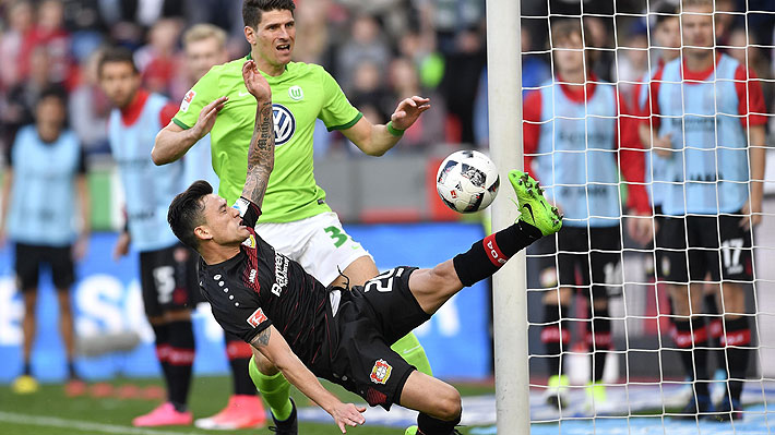Charles Aránguiz realizó una acrobática salvada en el duelo del Leverkusen ante el Wolfsburgo.