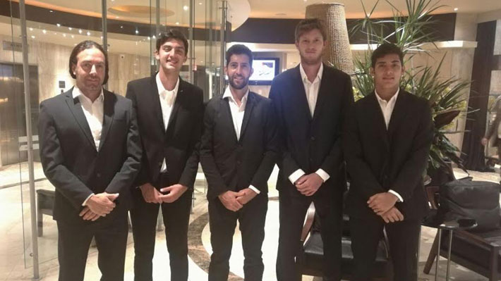 El capitán del equipo nacional junto a Tomás Barrios, Hans Podlipnik, Nicolás Jarry y Christian Garín en el lobby del hotel de concentración.
