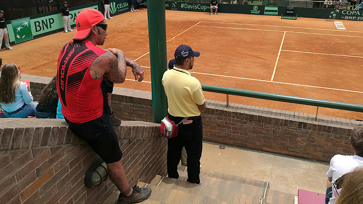 El ya "legendario" encordador de raquetas del equipo nacional, Exequiel Carvajal, más conocido como "Yogurt de Mora", quien lleva más de 25 años trabajando con los criollos, no paró de alentar a Jarry y Garín, en la primera jornada copera.