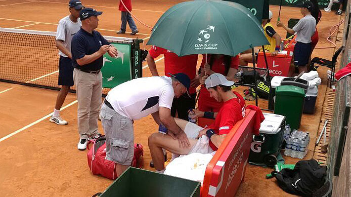 El kinesiólogo del equipo chileno en Copa Davis, Sergio Valdivia, le realizó trabajo kinésico al tenista Nicolás Jarry.