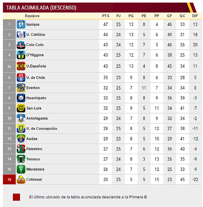 En la lucha por no descender, Palestino tomó un gran respiro al imponerse 2-1 a Unión Española. De esta forma, los árabes escalaron al puesto 13 de la clasificación Acumulada, donde Cobresal es colista exclusivo, con sólo 20 puntos.