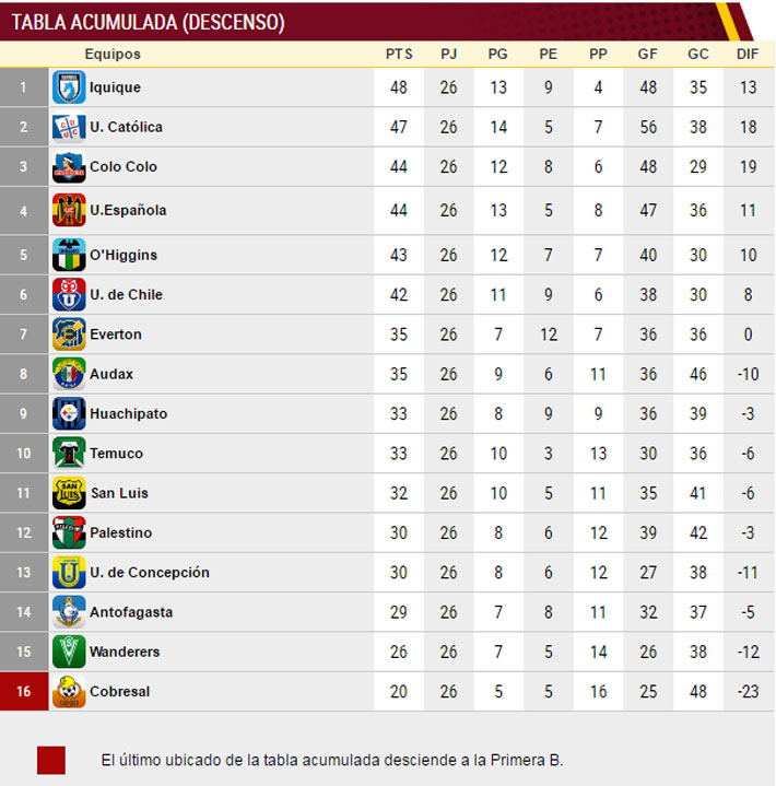 En tanto, Cobresal continúa hundido en el fondo de la clasificación Acumulada y el fantasma del descenso está cada vez más cerca. Los mineros cayeron 3-2 ante Palestino en un duelo que era clave en su aspiración de no bajar de categoría. Está todo mucho más complicado.