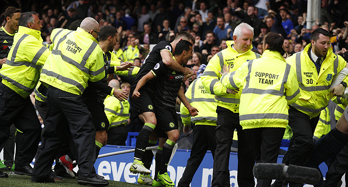 Pedro celebró junto a un hincha su conquista sobre el Everton.