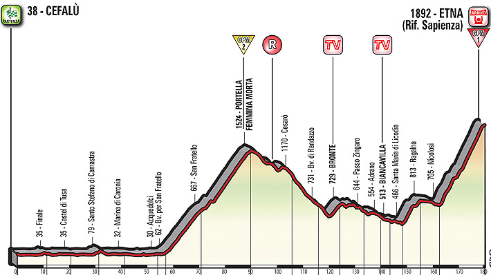 Ha considerado oportuno la organización considerar la jornada de media montaña, que incluye a mitad de recorrido la subida de Portella Femmina Morta, de segunda categoría, cuesta muy tendida, pero muy larga, más de 30 kilómetros, apta para calentar las piernas y limar las fuerzas del pelotón antes de trepar al Etna, donde esperan 18 kilómetros al 7 por ciento. No será el principal muro de la presente edición, pero es el primer juez.