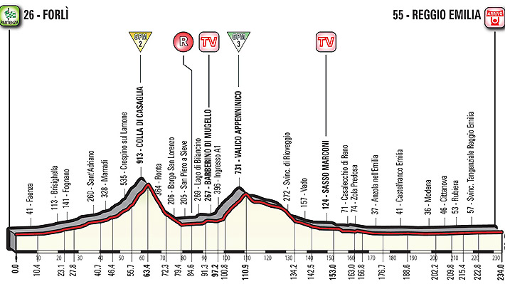 La duodécima etapa llevará al pelotón desde Forli a Reggio Emilia a través de 229 kilómetros, la más larga del Giro del Centenario.