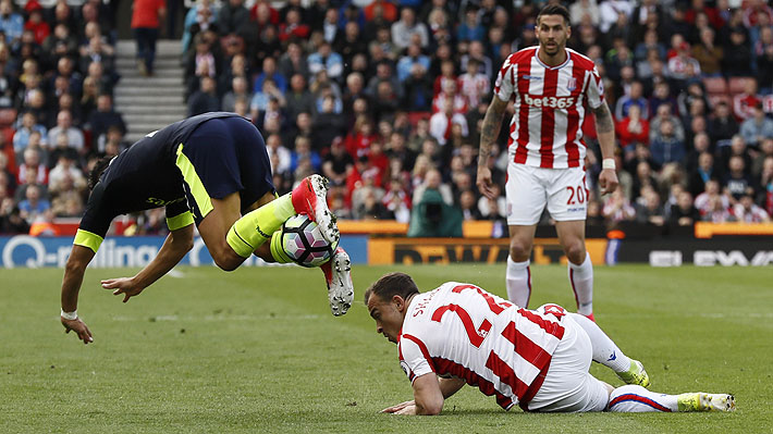 El atacante chileno del Arsenal Alexis Sánchez cae durante un partido ante el Stoke City.