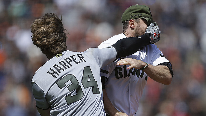 El conflicto se desató cuando el jugador de Francisco, Hunter Strickland, lanzó un fuerte pelotazo, el que llegó a la cadera de Bryce Harper, quien no se lo tomó nada de bien.