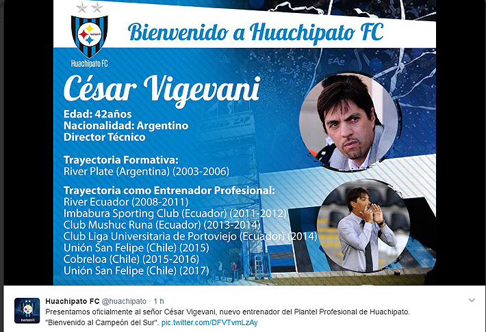 Se trata del argentino César Vigevani, de 42 años, quien viene de dirigir a Unión San Felipe en la Primera B.