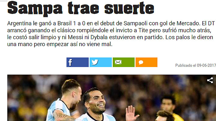 El mismo medio destaca otro aspecto, uno más futbolístico. "Argentina ya no juega sólo para Messi. La Selección, en el primer partido de Sampaoli, no dependió exclusivamente de lo que produjo Messi en ofensiva. Mostró otras variantes para atacar".