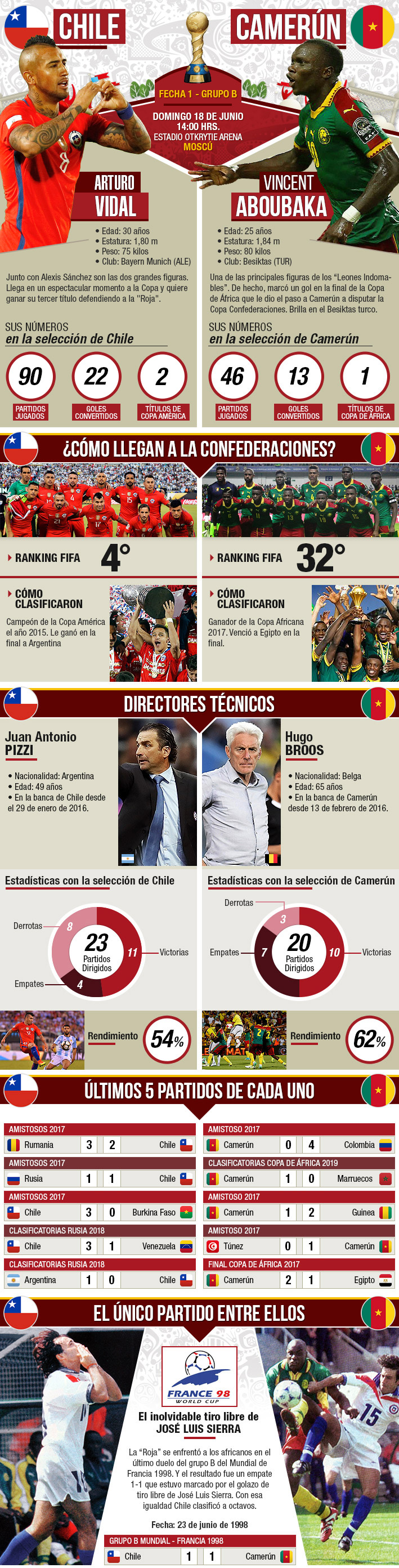 Cómo llegan al debut en la Confederaciones y el solitario historial entre Chile y Camerún