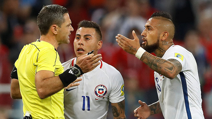 Vidal enfrenta al juez del Chile-Camerún tras una aplicación del VAR.