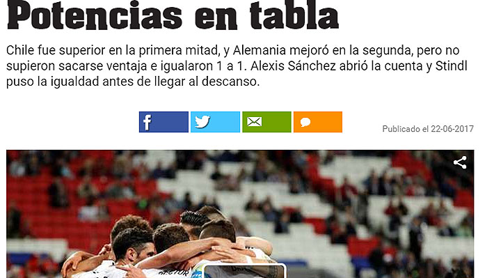 "Chile reparte puntos con Alemania y ambos ponen un pie en semis. El campeón de la Copa América empató con el campeón del mundo, pero ambos equipos quedaron a un punto de sellar su clasificación a la segunda ronda de la Copa Confederaciones. En el Kazan Arena, germanos y sudamericanos jugaron un partido demasiado táctico, dominado en la primera parte por Chile e igualado en la segunda con la participación de Marc-André ter Stegen en el arco de Alemania por decisión de Joachim Löw".