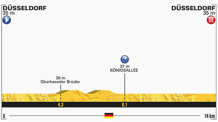 Düsseldorf, ciudad bañada por el Rin, será la sede de la salida. Por cuarta vez saldrá el Tour de Alemania, la última hace 30 años en Berlín. Una crono de 14 kilómetros permitirá soñar a la afición local, que espera que Tony Martin les dé la satisfacción de vestir el primer maillot amarillo 2017.