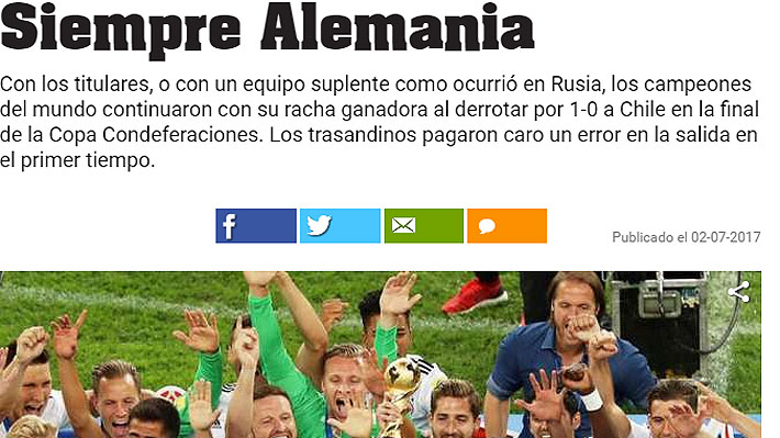 "A los teutones, con un proyecto serio desde hace varios años, no los podés perdonar. Si lo sabrá Argentina. Y ahora el que sufrió fue Chile, porque no pegó cuando pudo hacerlo y lamentó un error notorio: Marcelo Díaz se equivocó en la salida, los europeos presionaron y Stindl anotó el único gol del partido. Para destacar también lo de los chilenos, que jugaron su tercera final consecutiva y ahora deberán luchar para llegar al Mundial de Rusia".