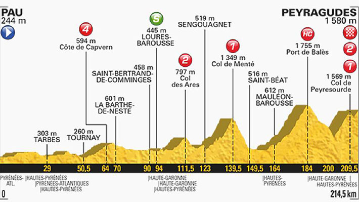 La duodécima etapa del Tour recorrerá el jueves parte de los Pirineos, con una espectacular llegada en el puerto de Peyragudes, después de seis ascensiones y 214,5 kilómetros a partir de Pau.