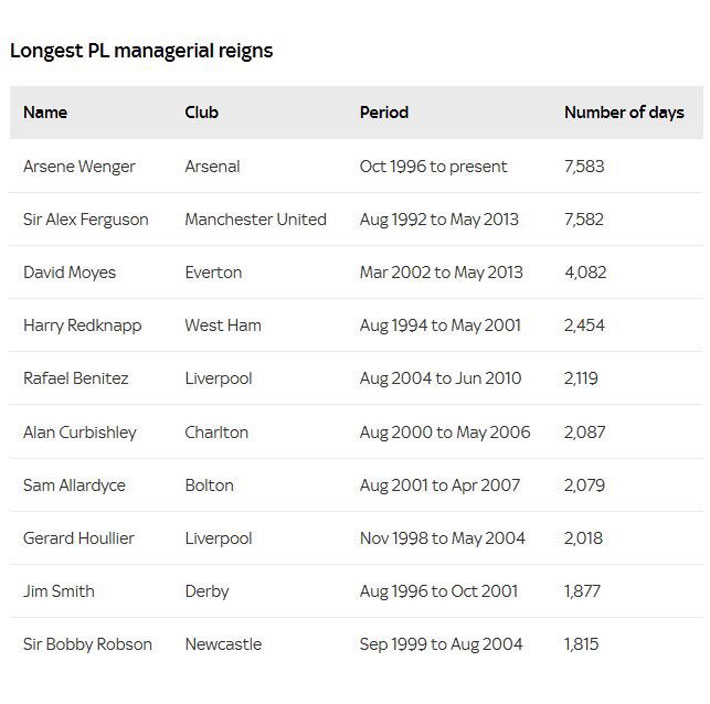 Desde hoy es Arsene Wenger el que lidera este listado. El francés sumó 7.583 días en la banca del Arsenal, considerando desde el 22 de septiembre de 1996 a la fecha.