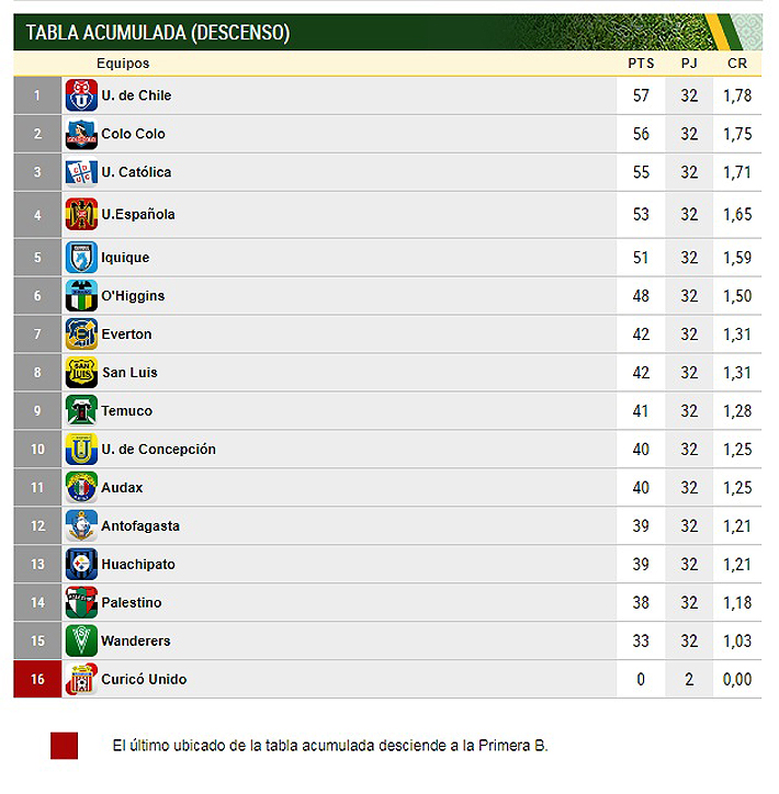 Con respecto a la Acumulada, Curicó Unido sigue como último. Los "torteros" volvieron a caer, y ahora fueron derrotados 2-1 por Palestino, cuadro que quedó en la medianía de la tabla en el Transición.