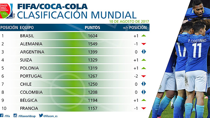 Dentro de las novedades, en esta última actualización Brasil se convirtió en el nuevo número uno desplazando a Alemania al segundo puesto. Argentina se mantuvo tercera.