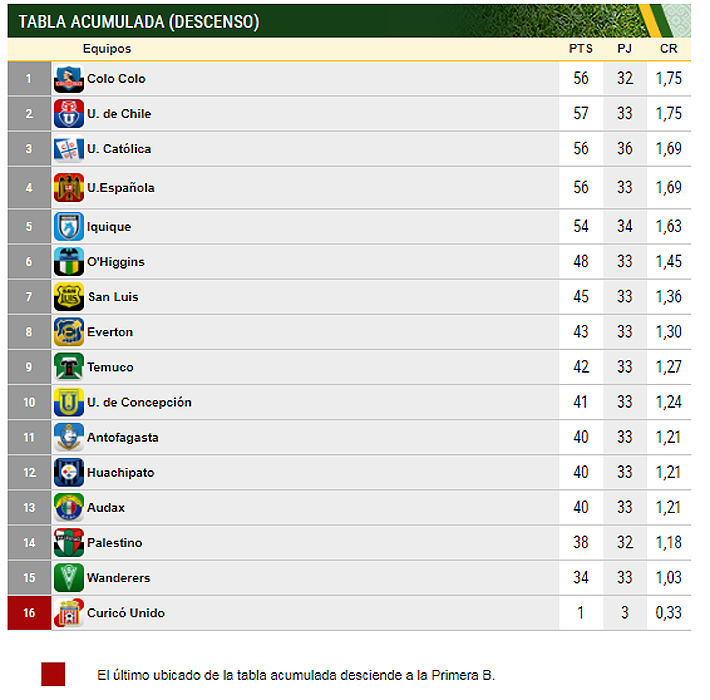 Respecto a la clasificación acumulada, es Curicó Unido quien continúa en el fondo, con un coeficiente de rendimiento de sólo 0,33, el que aumentó sólo gracias al empate que consiguieron frente a Santiago Wanderers.