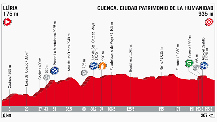 Este viernes de disputa la séptima etapa entre Llíria y Cuenca, con un recorrido de 207 kilómetros. Se trata de otra jornada de media montaña, con un terreno "rompepiernas" hasta llegar a meta. La subida al castillo -tercera categoría, a menos de 20 kilómetros de la sentencia-, con su característico empedrado, provocará seguramente divisiones y cortes que podrían provocar más de una sorpresa.