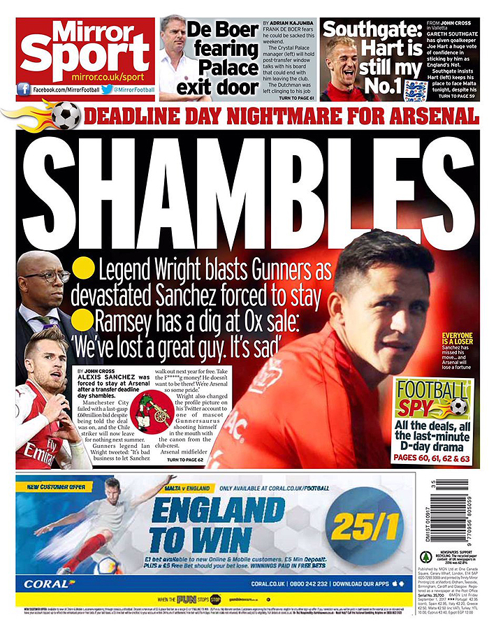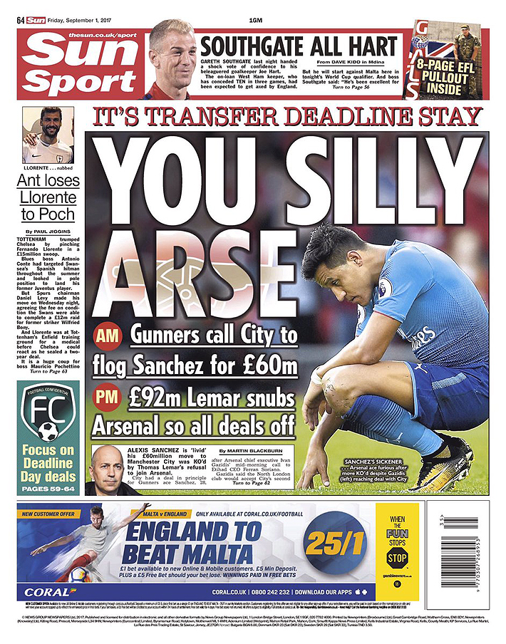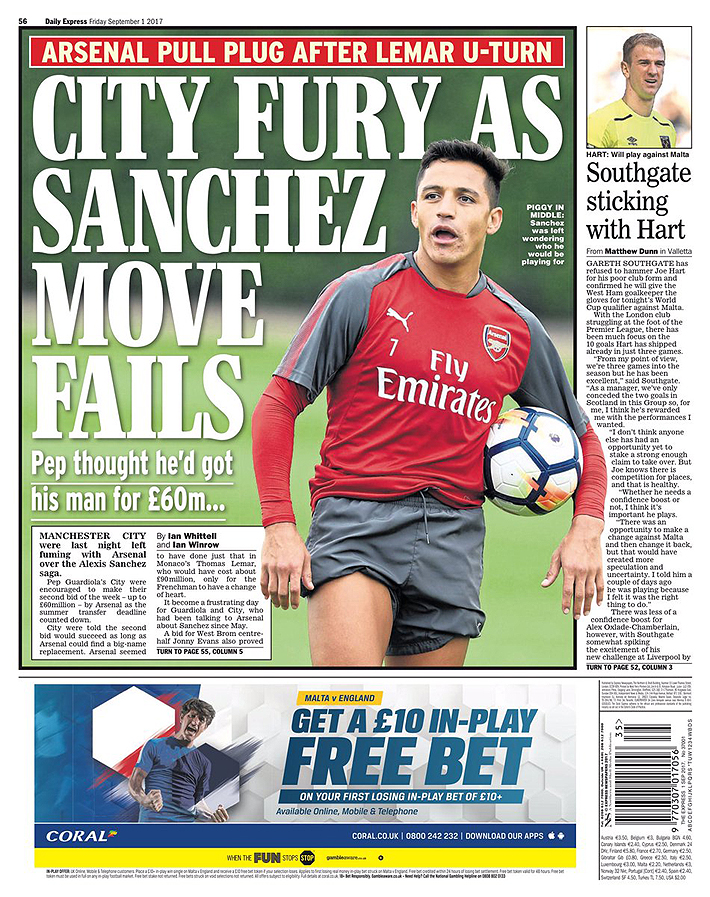 Por ejemplo, el diario Daily Mail tituló que la escuadra de Manchester "está furiosa con el Arsenal después de que se cayera la oferta de 60 millones de euros por Alexis Sánchez".