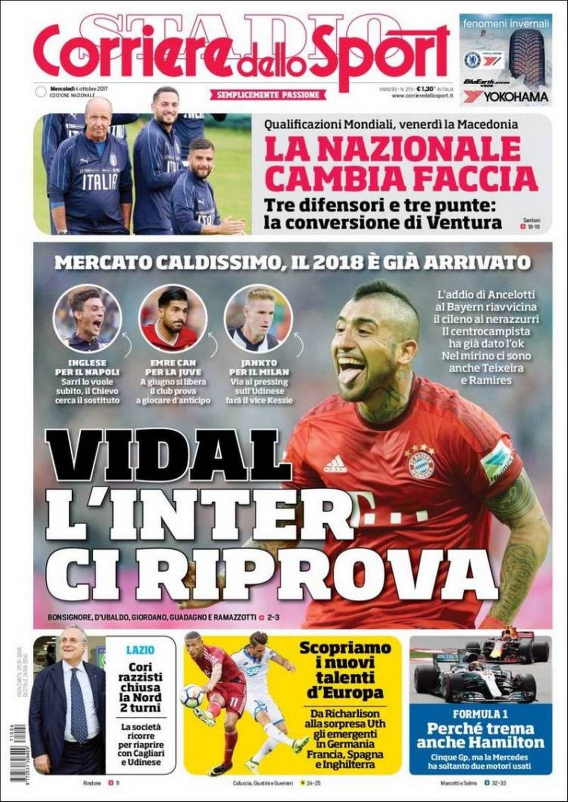Según la portada del reconocido periódico deportivo Corriere dello Sport, el seleccionado de la "Roja" es la prioridad de la directiva del Inter.