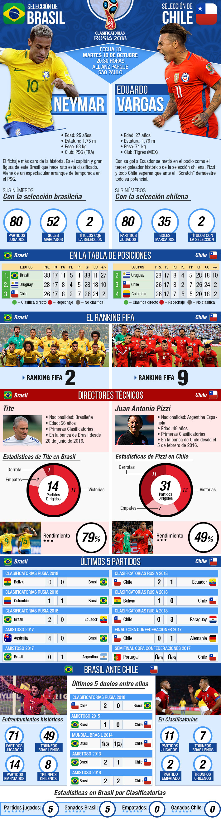 Pese al mal registro histórico jugando como visitante ante los brasileños, la última vez que se encontraron fue en el Mundial de 2014 y ahí la "Roja" sí rescató un empate en el tiempo regular.