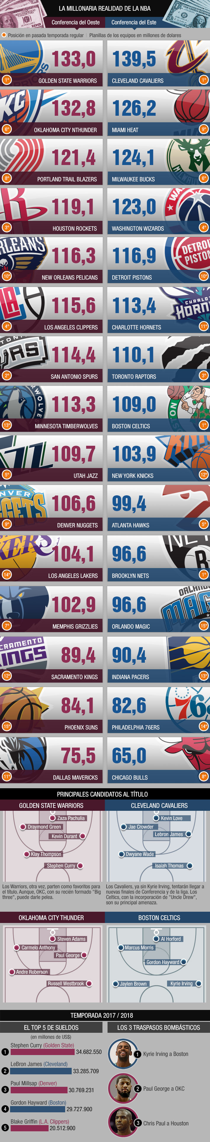 SANTIAGO.- Después de varios meses de receso, la NBA por fin está de vuelta. Y no será cualquier temporada, sino que esta tendrá varias cosas nuevas dentro de los equipos que buscarán destronar a Golden State: muchos millones de dólares y nuevas contrataciones asoman como las grandes novedades de cara a la fase regular.