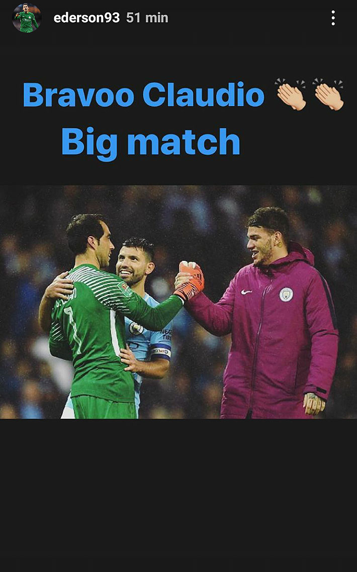 Pero Ederson no solo se quedó en eso, ya que a través de sus redes sociales, también se dio el tiempo de destacar lo hecho por su competencia en el arco del City.