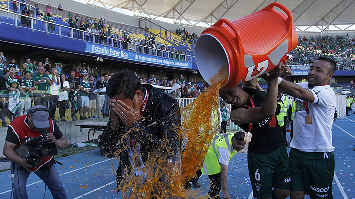 El técnico Nicolás Córdova recibió un "baño" de bebida isotónica, a modo de celebración, por parte de sus dirigidos (crédito: Aton).