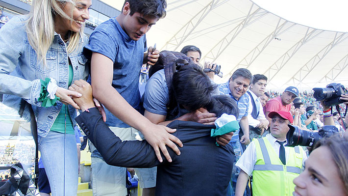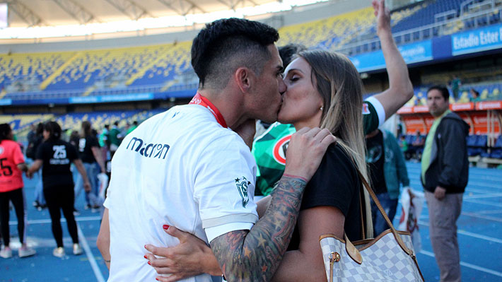 Jean Paul Pineda, quien marcó uno de los tantos en la victoria de Wanderers, acaparó las miradas con el beso a su novia, Faloon Larraguibel (crédito: Agencia Uno).