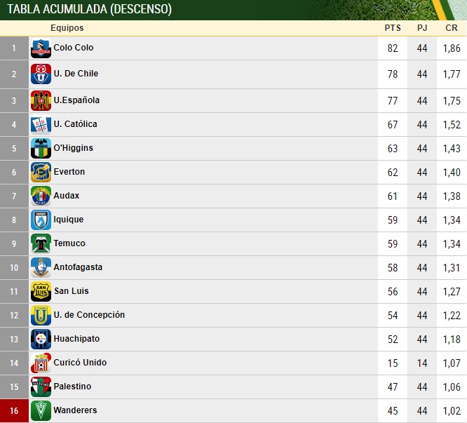 En la pelea por no descender, se encuentran Santiago Wanderers, Palestino y Curicó Unido. Uno de estos tres cuadros, el que finalice en el último lugar de la Acumulada, irá a definir su permanencia en la división de honor ante el ganador de la final de la Primera B entre Unión La Calera y San Marcos de Arica.