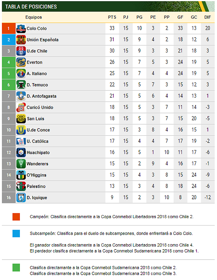 El cuadro albo finalizó en lo más alto de la tabla del campeonato, con 33 puntos, tres más que Unión Española, su más cercano perseguidor. Más atrás terminaron Universidad de Chile, con 30 y Everton, con 26.