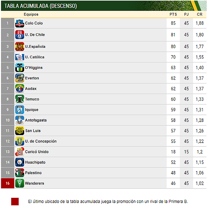 Respecto a la lucha por permanecer en Primera, fue Santiago Wanderers el club que se vio más perjudicado. El elenco porteño finalizó en el último puesto de la tabla Acumulada, por lo que deberá disputar la Promoción ante La Calera para no descender a Primera B.