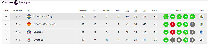 El cuadro donde milita Claudio Bravo suma 55 puntos, luego de 19 fechas jugadas, y registra 18 triunfos y un empate. Números impresionantes que lo tienen con 13 puntos de ventaja sobre el United, su más cercano perseguidor.