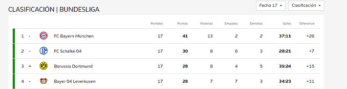 Aquí la distancia es menor a la que existe en Inglaterra, aunque sin dejar de ser considerable, puesto que su escolta en la tabla es el Schalke 04, con 30 unidades.