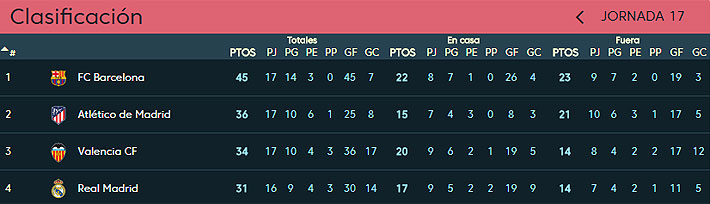 Como sublider aparece el Atlético de Madrid, con 9 puntos menos que los "culés", mientras que recién en el cuarto lugar asoma el Real con 14 puntos menos que sus archirrivales.