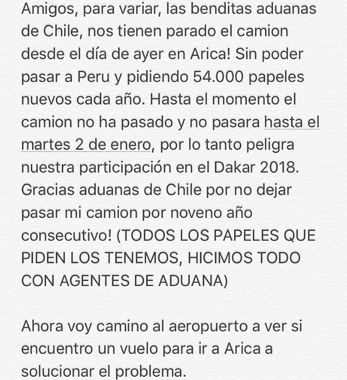 "Amigos, para variar, las benditas Aduanas de Chile nos tienen parado el camión desde el día de ayer en Arica. Sin poder pasar a Perú y pidiendo 54.000 papeles nuevos cada año. Hasta el momento el camión no ha pasado y no pasará hasta el martes 2 de enero, Por lo tanto peligra nuestra participación", disparó Casale en su cuenta oficial de Twitter.