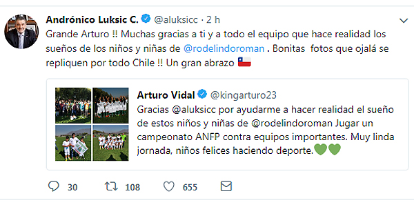 SANTIAGO.- El 29 de marzo recién pasado Arturo Vidal publicó un mensaje que iba directo para Andrónico Luksic. "Andrónico, miles de niños me escriben para sumarse a Rodelindo,